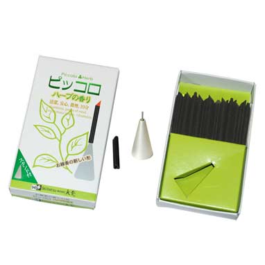 Daihatsu continues to innovate, and now offers us a most unusual incense: Piccolo Herb. The scent is unusual because in addtion to Lavender and Lemongrass, they add Palmarosa. Palmarosa is distilled from wild Palmarosa grass leaves grown in Nepal. Palmarosa has a soft, lemony-fresh green scent with hints of geranium and rose. The form of this incense is also unusual. It comes in short sticks that are molded in a triple-stick pattern so you get about triple the scent during the burn. In addition, the sticks are cast with a small hole in the bottom that allows this stick to be placed over a small pin in the included stand (see insert below). Order #: dh-x-1s Retail: No longer available 01/30/2011