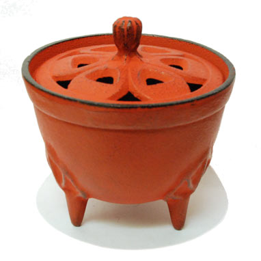 This round cast iron Koro is perfect for burning incense cones while you view the smoke curling through the geometric patterns in the lid. You may also use it with incense sticks by half-filling it with white ash into which you insert the burning incense stick (of course, the lid would be off while burning sticks). It's available in several colors including Red, and has these features:
